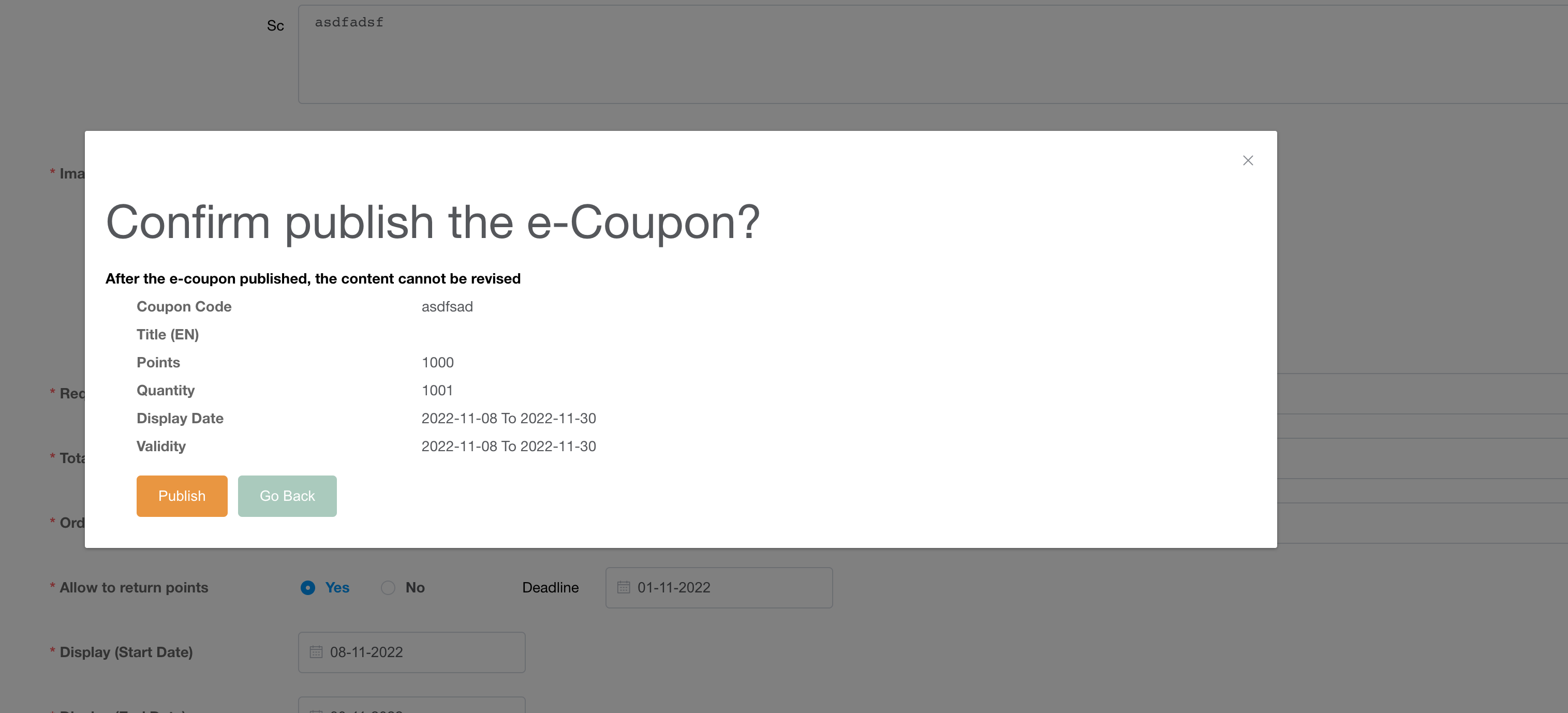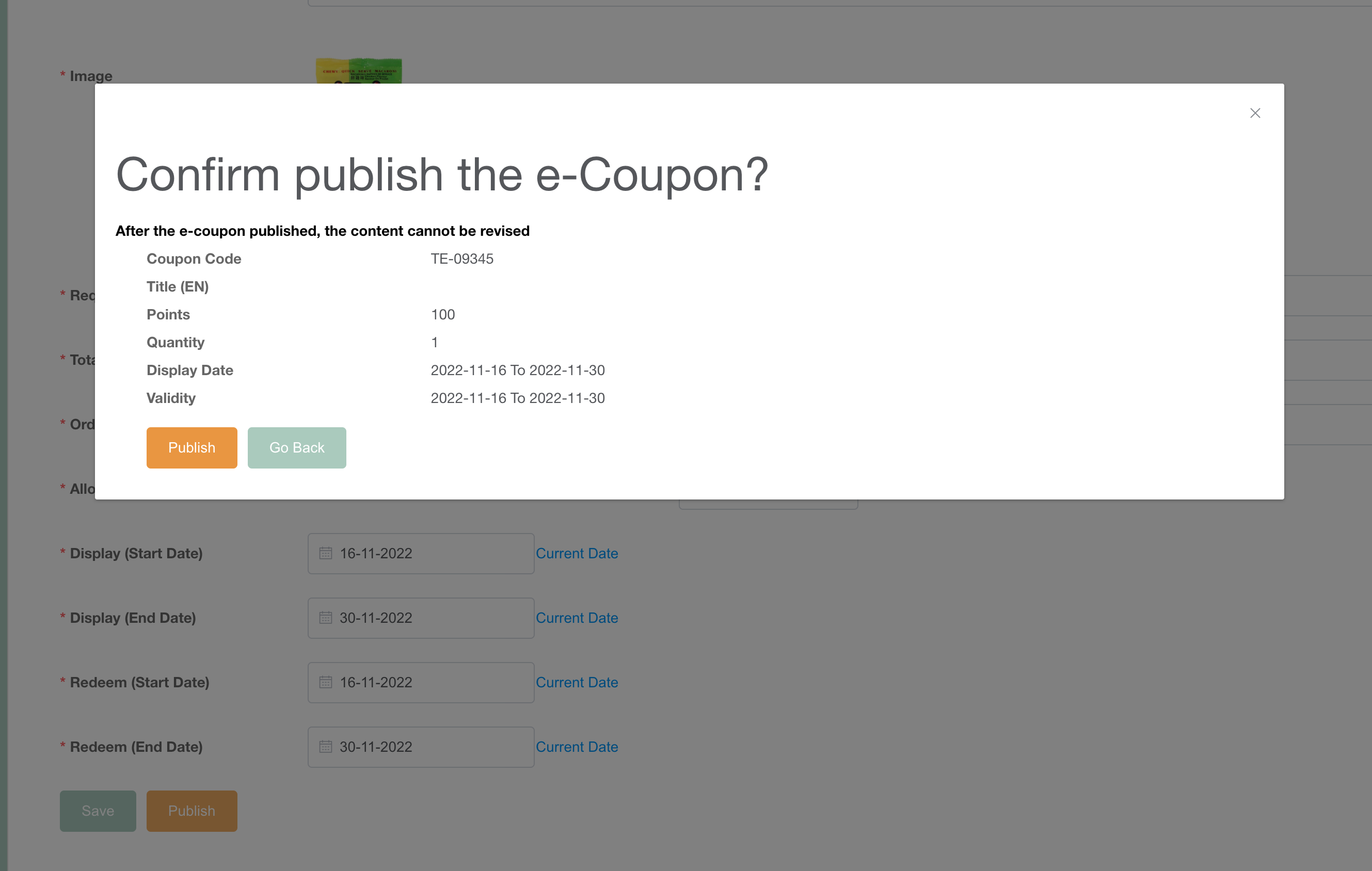 1、注意:在新增礼券时,点击Publish时显示的Title(EN)仍有问题,如上截图