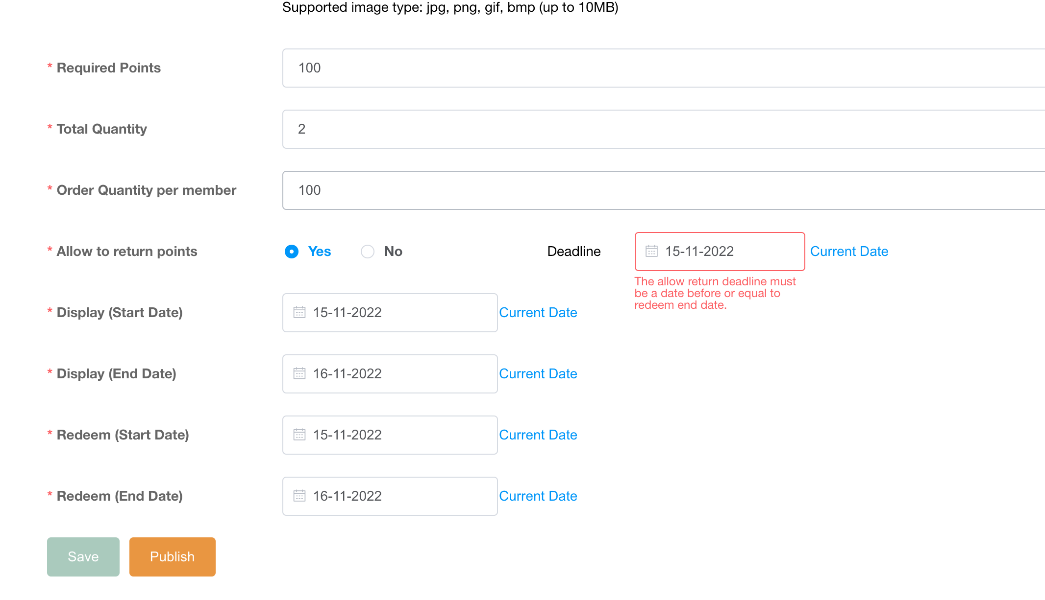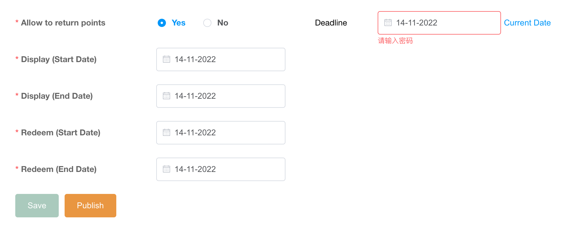 约束提示: The allow return deadline must be a date before or equal to redeem end date.
