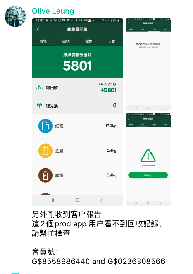 這2個prod app 用户看不到回收記錄,請幫忙檢查
