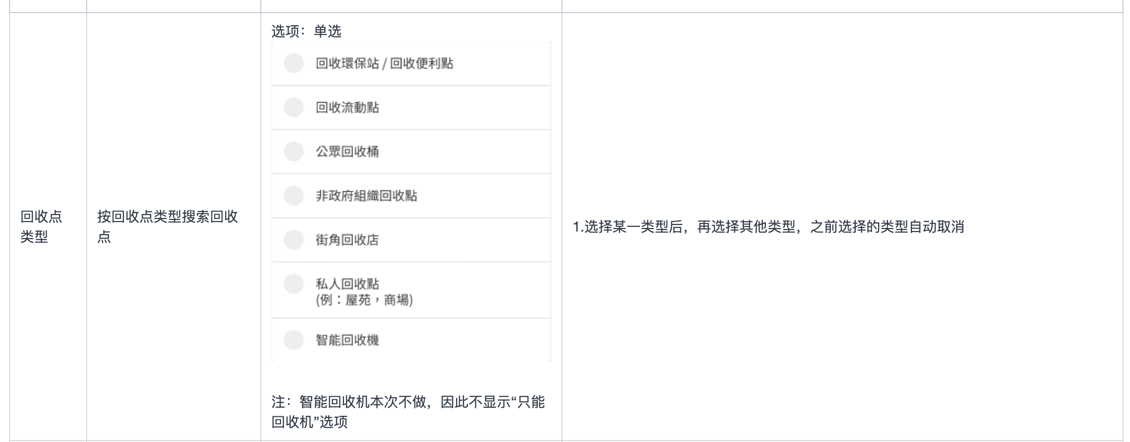 2、回收点类型筛选条件是单选,选择任一类型后其它类型会被取消选择,请参考禅道