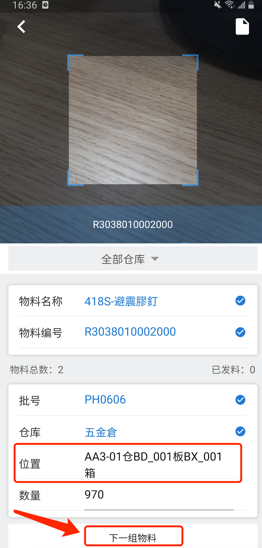 按推荐扫描物料标签,不扫描位置标签,点击“下一组物料”[结果]