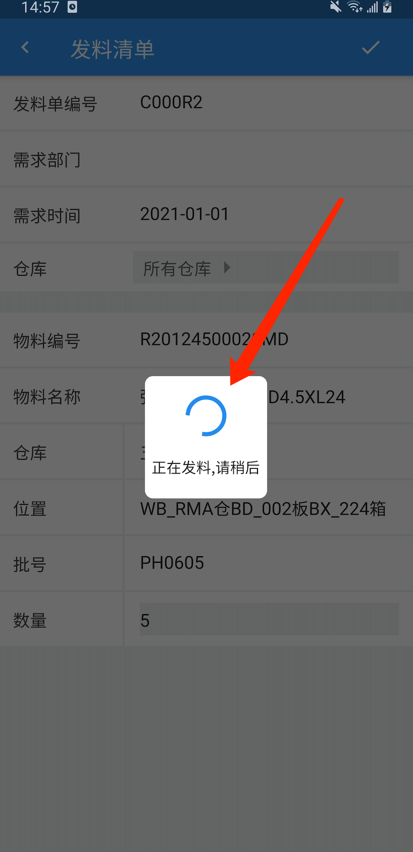 1)发料成功,库存物料减少