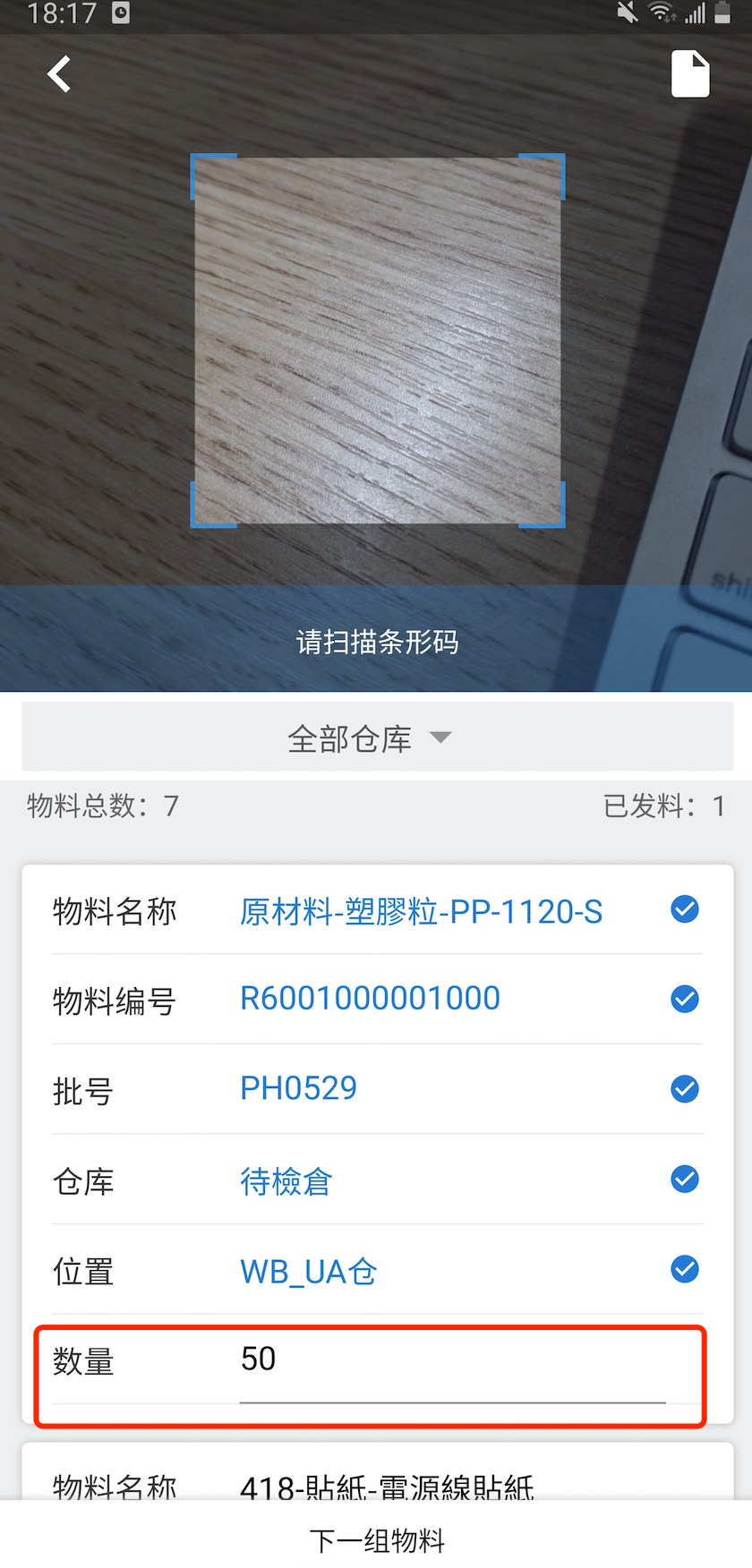 1)扫码发料列表进行上下滑动操作后,第一个物料的发料数量变更为默认数量