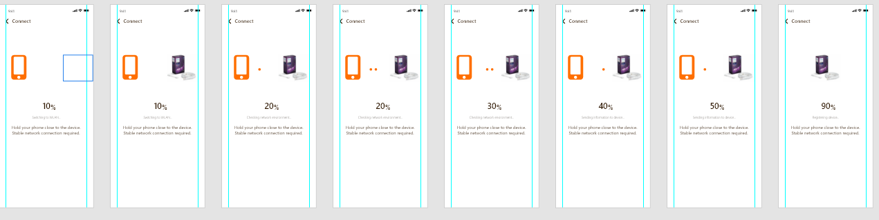 1.图标1根据连接设备进度,同步更新由 2.数字根据连接设备进度,进行数字更新由0%-10%-20%-30%-40%-50%-90%-100% 3.连接设备进度提示文本,根据数字更新进行同步更新: Turning on WLAN - 0% Switching to WLAN - 10% Checking network envionment -20%, 30% Sending information to device - 40%,50% Registering device -90%,100% 4.连接设备进度为100%,弹出图标2,进入连接正常网络 |