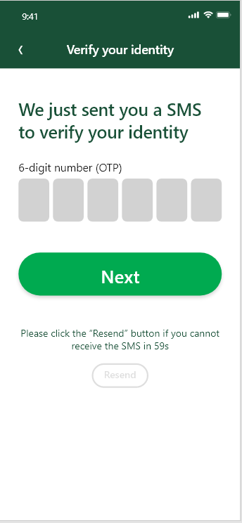 | 重发 | 重发验证码至手机 | 【Resend】按钮 | 1.点击按钮,重新发送短信验证码至手机,按钮变白,不可点击。过60s后,按钮变绿,可再次点击 |