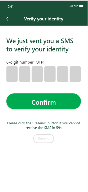 | 重发 | 重发验证码至手机 | 【Resend】按钮 | 1.点击按钮,重新发送短信验证码至手机,按钮变白,不可点击。过60s后,按钮变绿,可再次点击 |