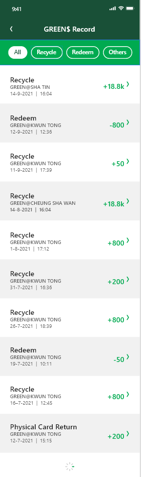1.点击recycle记录,进入【回收记录详情】页面 2.点击redeem记录,进入【兑换记录详情】页面 |