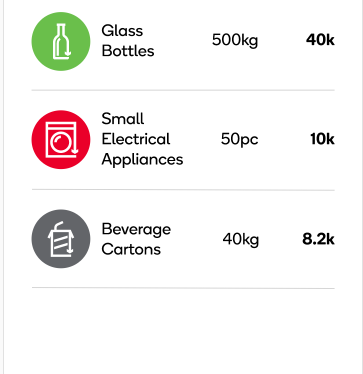| 总回收 | 展示顾客的回收获得总积分及重量 | Totak Recycel 1590kg/50PC(指回收废品的总重量和小型电器的总件数) |