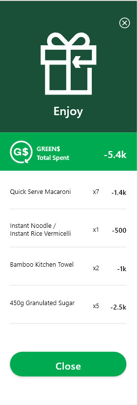 022-列表抬头:GREEN$ Total Redeem本次兑换消耗总积分(下方兑换列表的积分总和)列表清单:礼品名称,数量,消耗积分