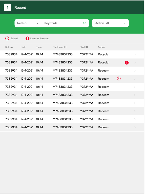 | 记录列表 | 展示 | 订单号,日期,时间,顾客ID,职员ID,行为,图标(有则标记),字段> 按时间先后排序 |