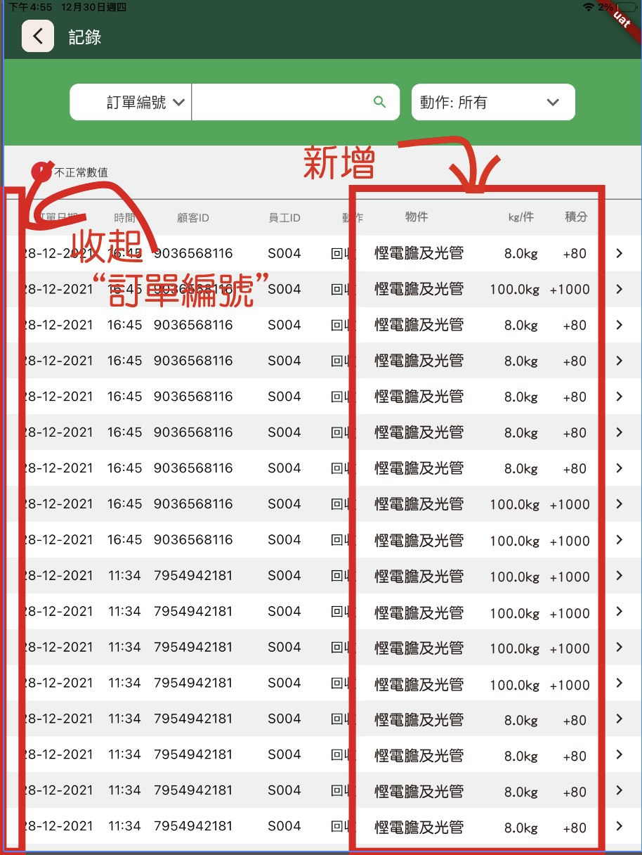 | 记录列表 | 展示 | 日期,时间,顾客ID,职员ID,行为,物品,数量,积分,图标(有则标记),字段> 按时间先后排序 |