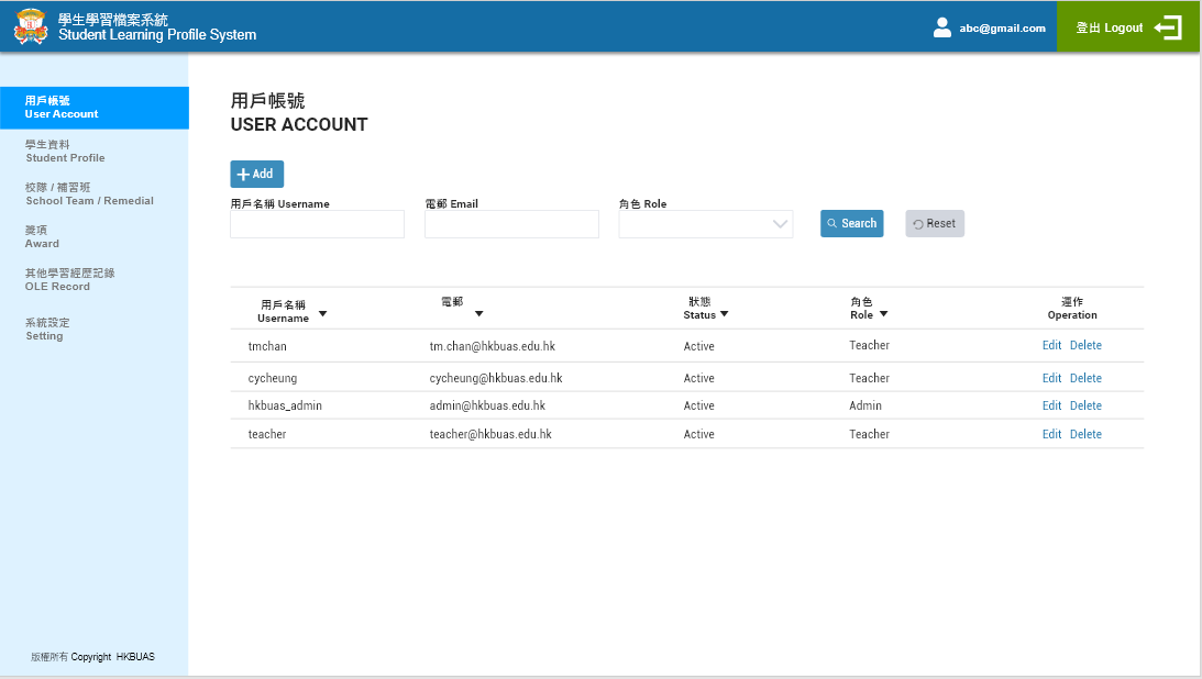 | 用户列表 | 显示+操作 | 字段: 用户名称 电邮 状态 角色 运作:编辑,删除 排序按钮: 列表默认按创建时间先后排序,无符合搜索条件/帐户显示为空 |