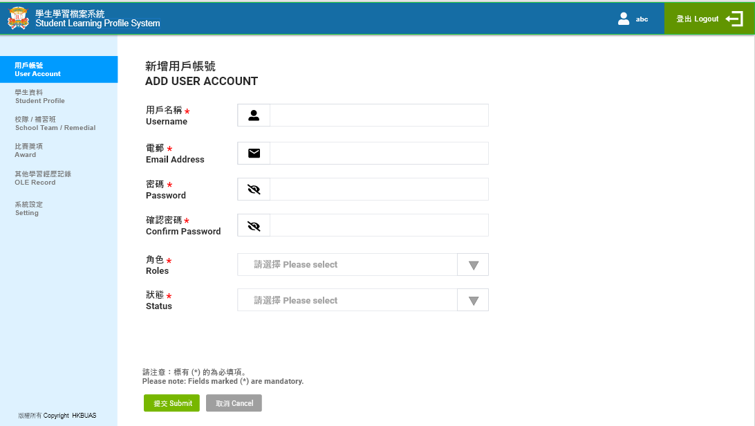 | 提交 | 确认新增用户 | 【提交】按钮 当必填项全部填好,按钮点色变亮可以点击 |