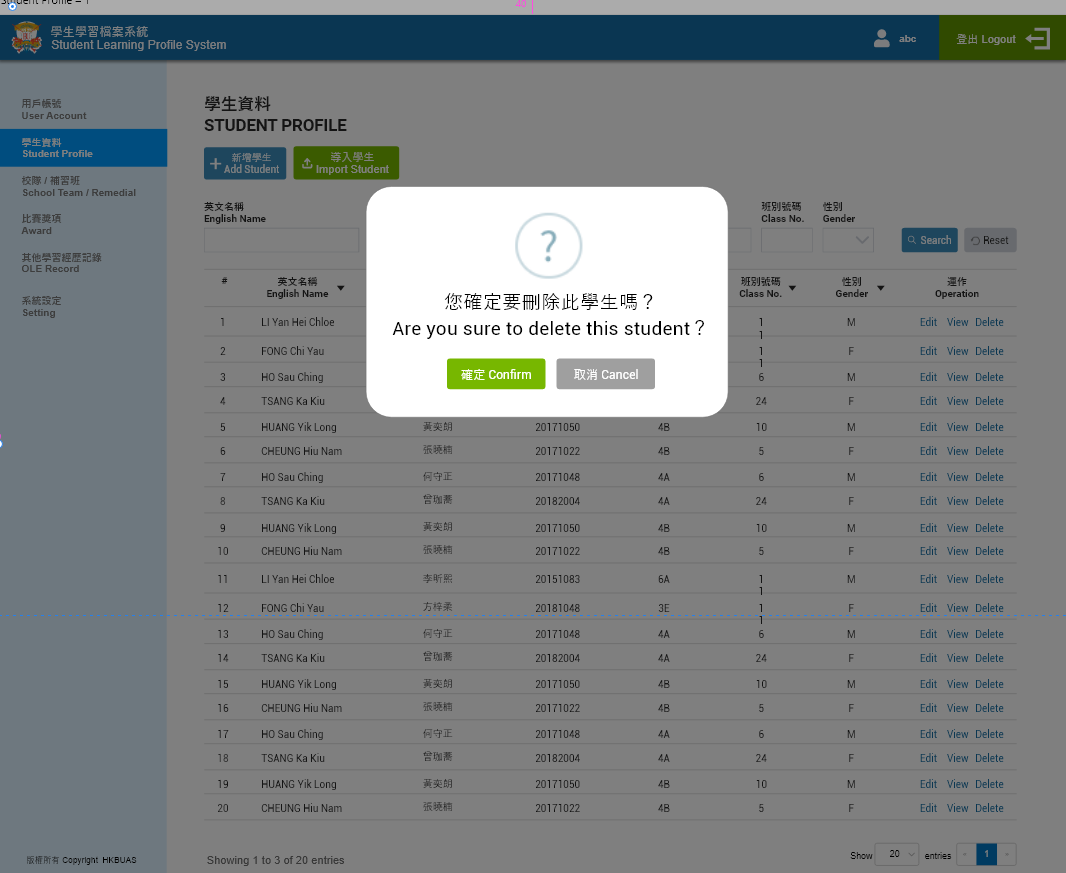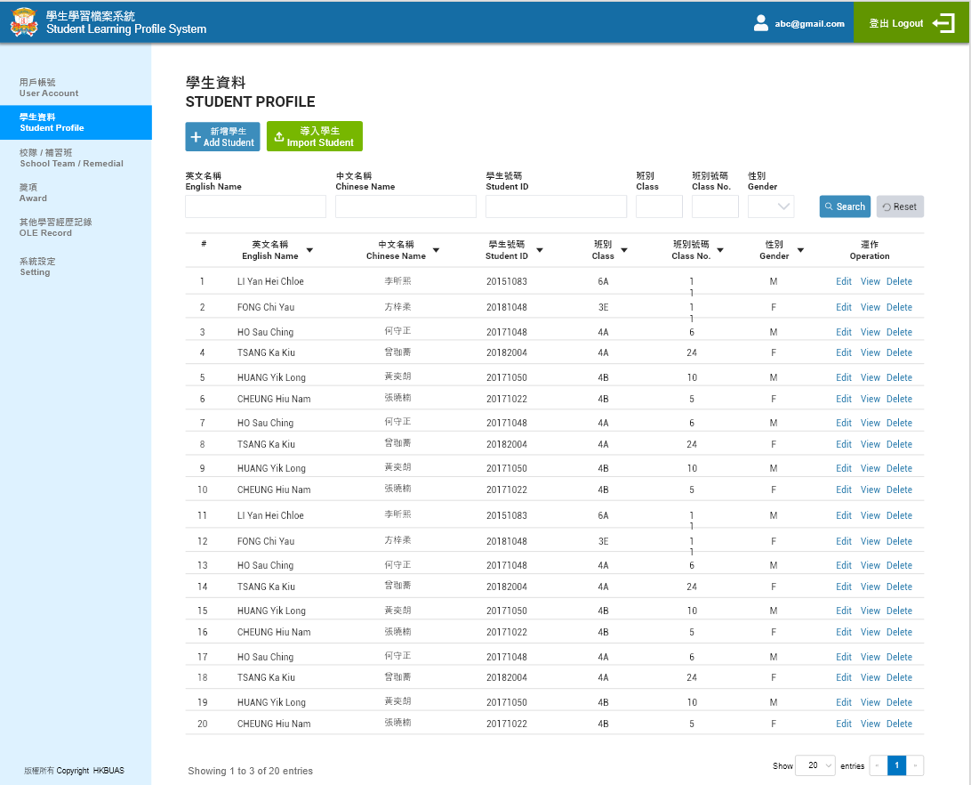 | 学生资料列表 | 显示+编辑 | 字段: #(编号) 英文名称 中文名称 学生号码 班别 班别号码 性别 运作:编辑,详情,删除 列表默认按创建时间先后排序,无符合搜索条件/学生资料显示为空 |