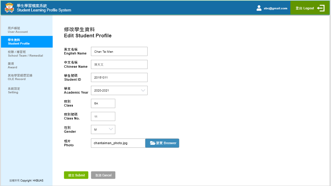 | 相片 | 上传相片 | 选择框,默认显示已填信息,必选 | 1点击选择框,选择相片上传 |