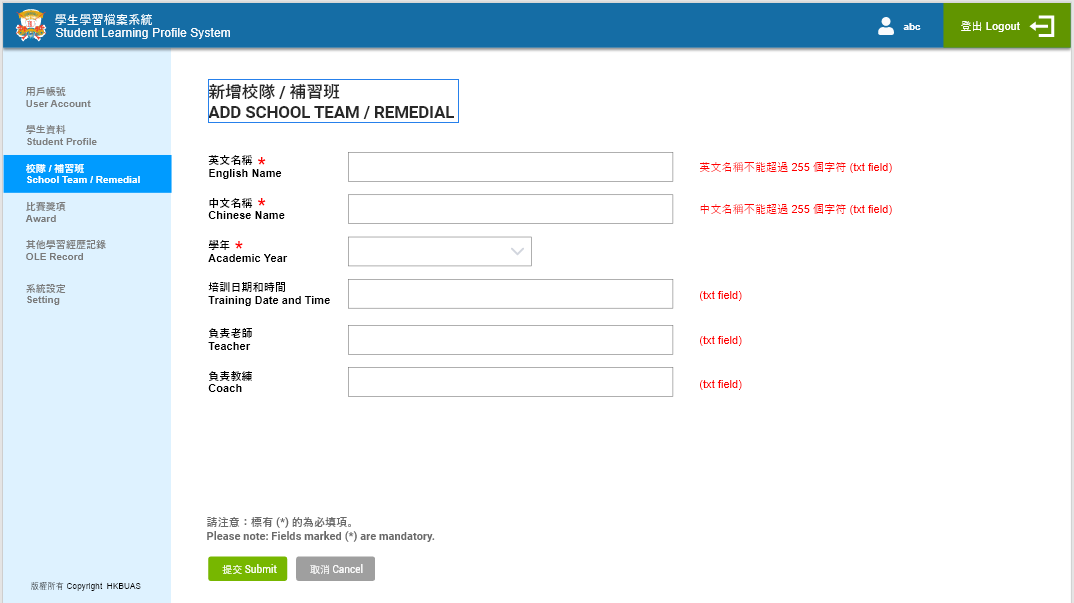 | 取消 | 取消新增校队/补习班 | 【取消】按钮 | 1.点击按钮,返回【校队/补习班列表】页面 |