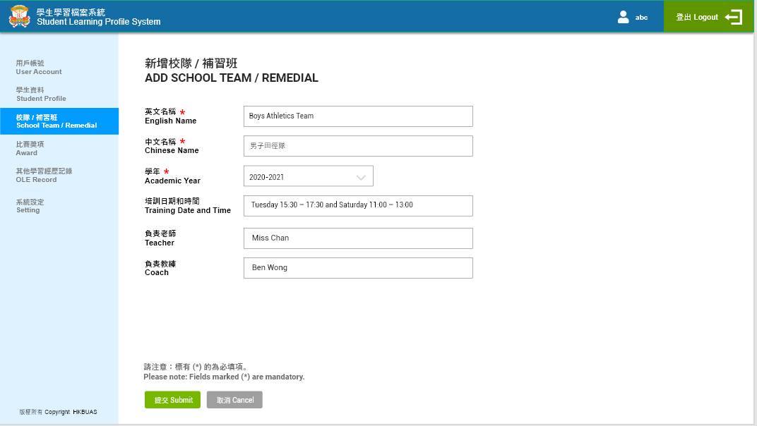 | 负责教练 | 输入负责教练 | 输入框,默认为空,选填 | 1.输入负责教练 |