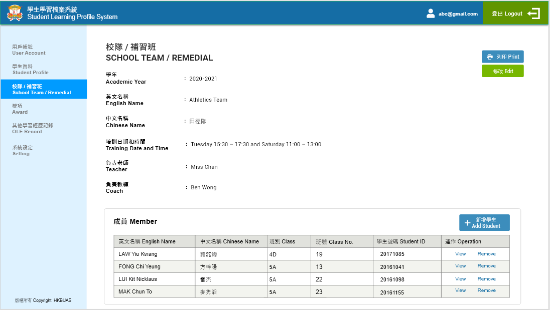 | 列印 | 打印校队/补习班详情 | 【列印】按钮 | 1.点击按钮,打印资料(信息+成员记录) |