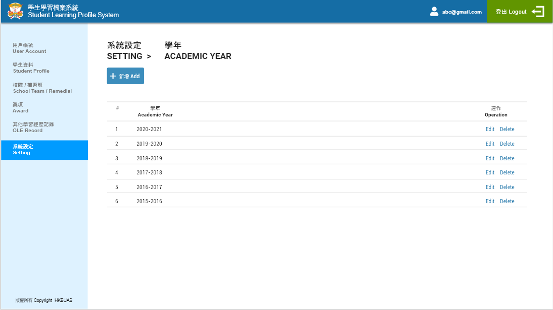 | 新增学年 | 新增学年 | 【新增】按钮 | 1.点击按钮,进入【新增/编辑学年】页面 |