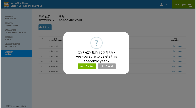 1.点击编辑,进入【新增/编辑学年】页面 2.点击删除,弹出弹窗,点击确认,删除学年,点击取消关闭弹窗 |