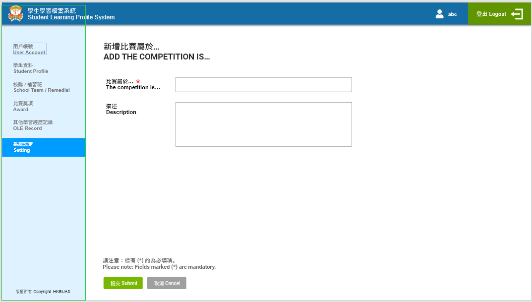 | 比赛属于 | 输入比赛属于 | 输入框,默认为空,必填 | 1.输入比赛属于 |