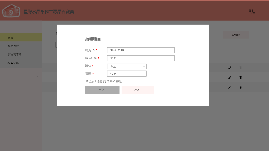 | 确认 | 确认编辑职员 | 【确认】按钮 当必填项全部填好,按钮点色变亮可以点击 |