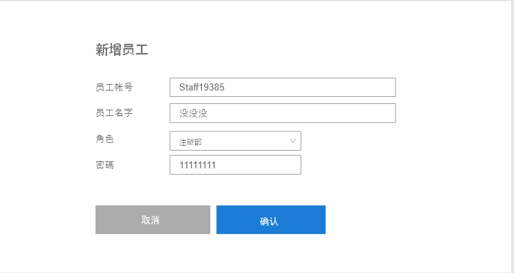 | 员工帐号 | 输入職員 ID | 输入框,默认为空,必填,不能重复 | 1.输入员工帐号 |