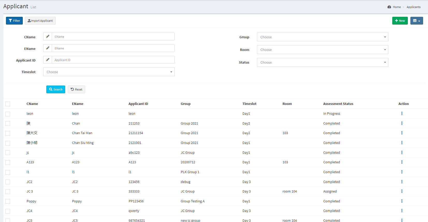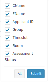 字段: 中文名 英文名 申请id 组 时间槽 房间 评估状态 操作:编辑(已完成状态不显示删除按钮),删除 列表默认按用户创建时间先后排序(先得在前),无符合搜索条件/面试时显示空图标 |