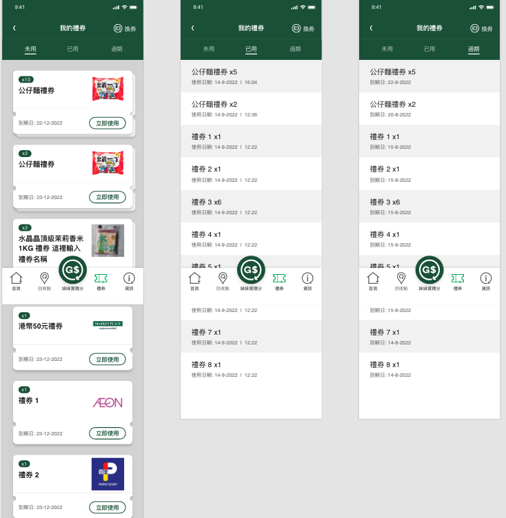 1.每行左右显示礼券,按有效期依次向下正序排列 2.礼券: 封面 礼券名称 到期日:指使用礼券的到期日 左上角显示该礼券数量 |
