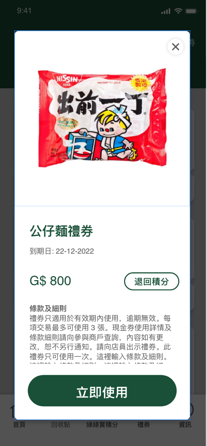1.图片 2.文本: 礼券名称 到期日 描述 条款及细则 绿绿赏积分 |
