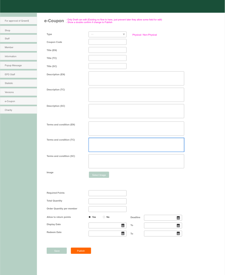 | 发布 | 发布礼券 | 【Publish】按钮 | 1.点击按钮,关闭弹窗,回到【礼券列表】,发布礼券成功 2.必填内容没有输入时,按钮灰色,不可点击 |