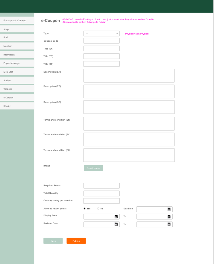 | 发布 | 发布礼券 | 【Publish】按钮 | 1.点击按钮,弹出确认窗(如图2) 2.必填内容没有输入时,按钮灰色,不可点击 |