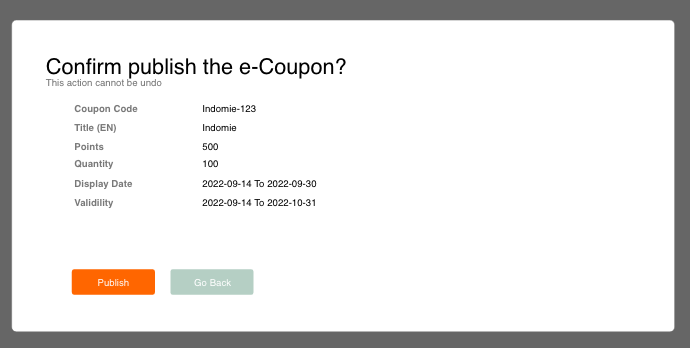 | 返回 | 取消发布 | 【Go Back】按钮 | 1.点击按钮,回到【礼券列表】,取消发布 |