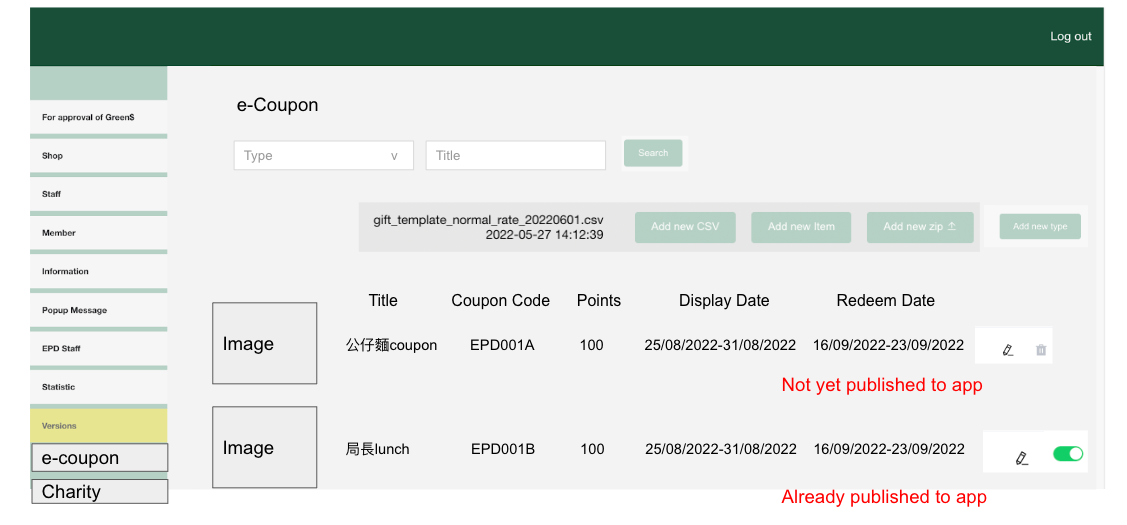1.点击编辑按钮,打开【编辑礼券】弹窗 2.点击删除图标,删除礼券,已发的礼券不可删除 3.开启按钮,礼券可发布到APP,关闭按钮礼券不可发布到APP 4.剩余数量实时更新 |