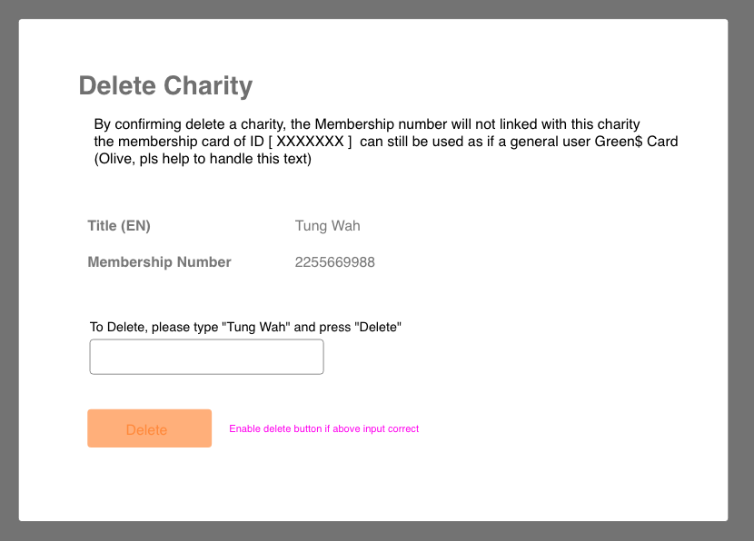 064+ <p>By confirming delete a charity, the Membership number will not linked with this charity<br />the membership card of ID [ XXXXXXX ] can still be used as if a general user Green$ Card</p>