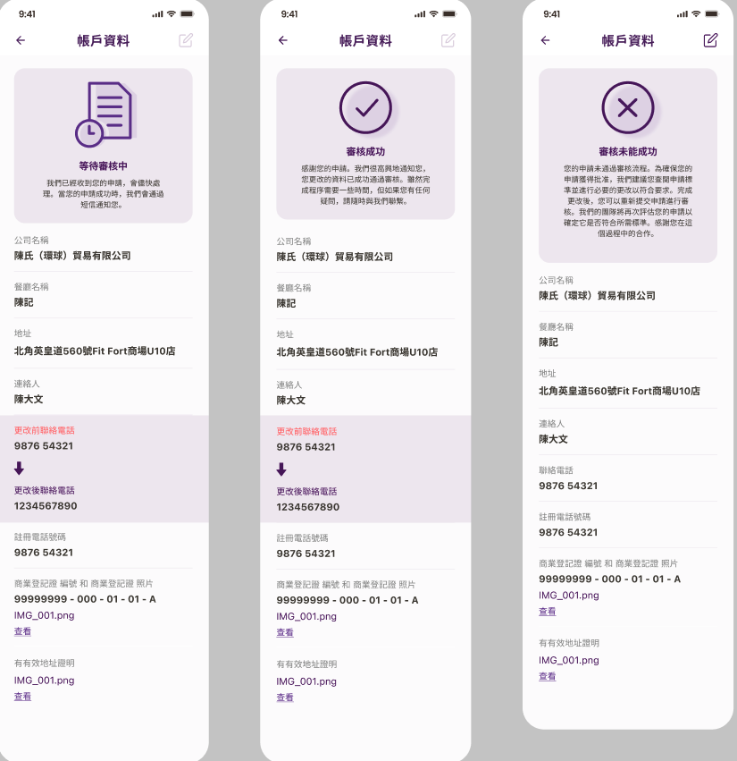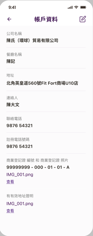 公司名称 餐厅名称 地址 联络人 联络电话 注册电话号码 商业登记证编号和商业登记证照片 有效地址证明 |