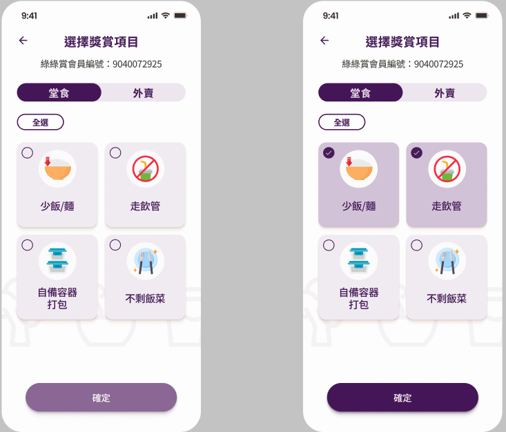 | 全选 | 选择所有奖赏项目 | 按钮【全选】 | 1. 点击按钮,堂食下的所有项目被选中,再次点击,取消所有项目的选择。 |