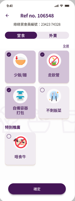 1. 点击按钮,切换堂食/外卖; 2. 当在堂食选择了某一项后,切换至外卖,堂食的选项被清空。 |