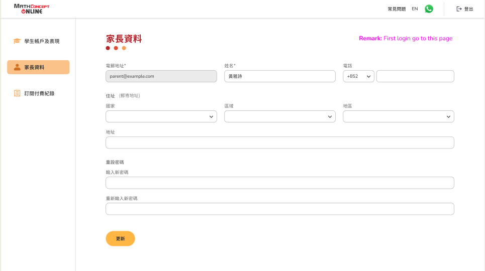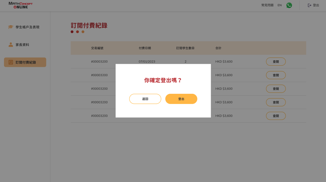进入学生帐户及表现、家长资料、订阅付费记录均显示常驻