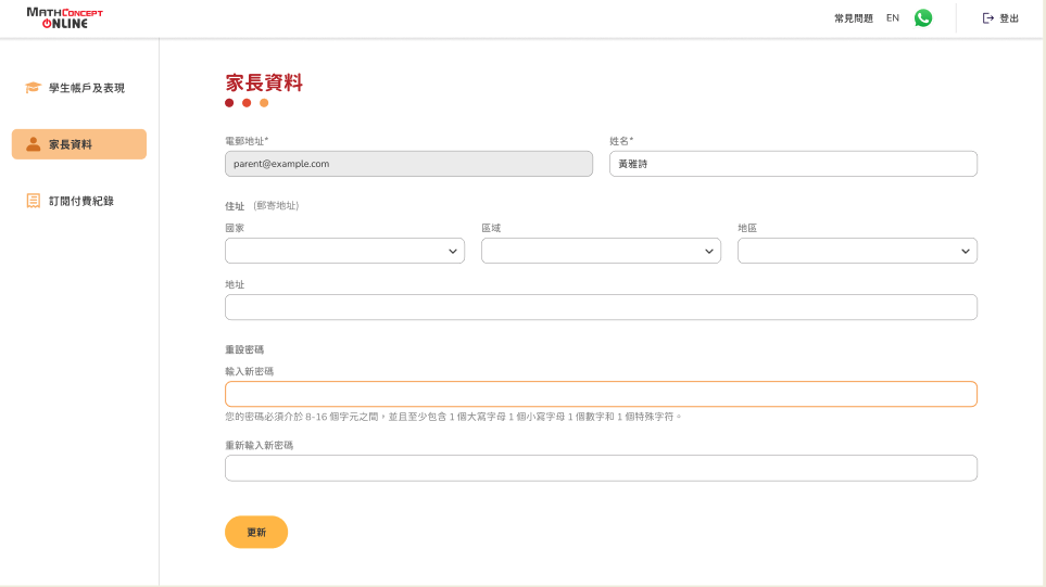 | 重置密码 | 重置密码 | 输入框,选填 | 1.如果输入的密码不符合要求,需提示:您的密碼必須介於 8-16 個字元之間,並且至少包含 1 個大寫字母 1 個小寫字母 1 個數字和 1 個特殊字符。 |