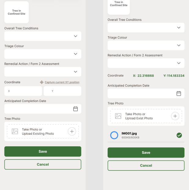 1.選擇部門樹木編號,選擇後顯示對應的樹木編號,樹種 2.輸入胸徑 3.輸入樹木高度 4.輸入樹冠闊度 |