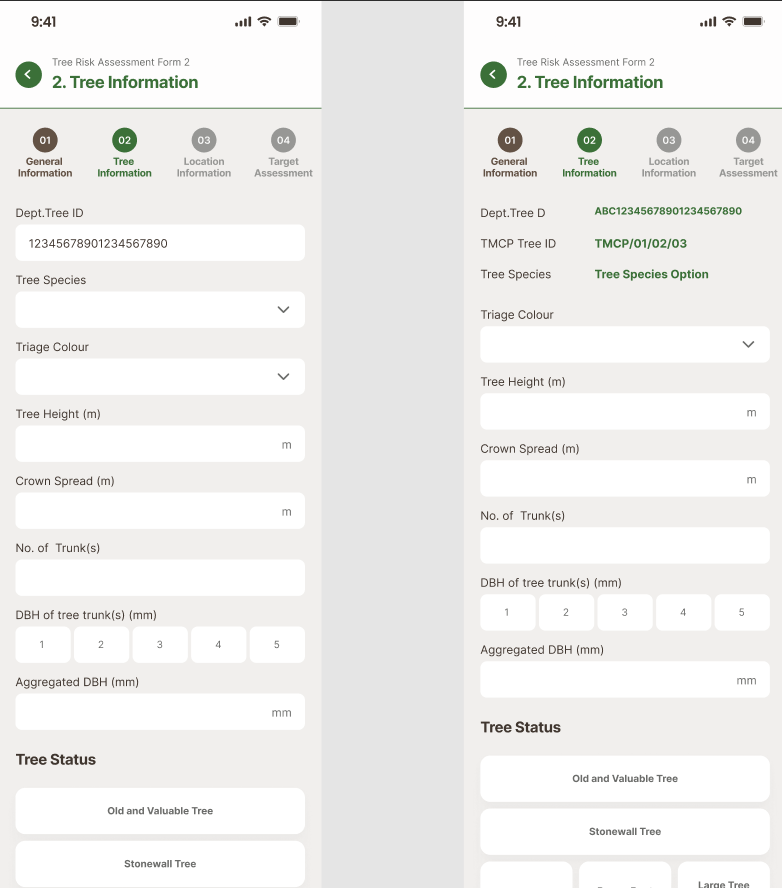 a部門樹木編號,輸入下拉選擇列表,只有选择了“部门树ID”,才能填写其他字段 b.樹木編號,文本 c.樹種,文本 d.分流顏色,下拉選擇框 e.樹高(米),輸入框 f.樹冠闊度(米),輸入框 g.樹幹樹木,輸入框 h.每枝主幹胸徑(毫米),選擇框,(12345),單選 i.總胸徑(毫米),輸入框 |