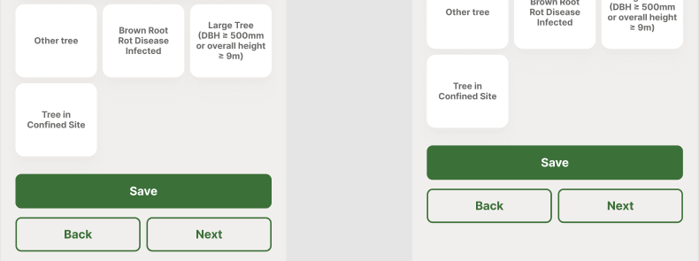 選擇框 a.古樹名木 b.石牆樹 c.受褐根病感染 d.大樹 (胸徑>=500毫米或高度>=9米) e.其他樹木 f.受褐根病感染 g.擠迫地點的樹木 |