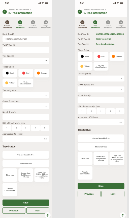 042- <p><span>2.9 Aggregated DBH (mm) 總胸徑 (毫米)<br />2.10 Tree Status 樹木類別<br />2.10.1 Old and Valuable Tree 古樹名木<br />2.10.1.1 OVT No. 古樹名木登記冊編號<br />2.10.2 Stonewall Tree 石牆樹<br />2.10.2.1 Tree Register No. 樹木登記編號<br />2.10.3 Large Tree (DBH &gt;= 500mm or overall height &gt;= 9m) 大樹 (胸徑&gt;=500毫米或高度&gt;=9米)<br />2.10.4 Other tree 其他樹木<br />2.10.5 Brown Root Rot Disease Infected 受褐根病感染<br />2.10.6 Tree in Confined Site 擠迫地點的樹木<br /></span></p>
