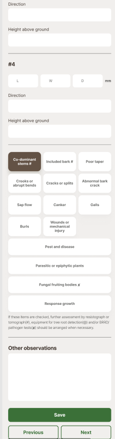 034+ <p>9.2 <br />9.2.1 Co-dominant stems # 等勢枝<br />9.2.2 Included bark # 內夾樹皮<br />9.2.3 Poor taper 不良漸尖生長<br />9.2.4 Cracks or splits 裂縫或裂開<br />9.2.5 Abnormal bark crack 不正常樹皮裂紋<br />9.2.6 Sap flow 滲液<br />9.2.7 Crooks or abrupt bends 不常規彎曲<br />9.2.8 Canker 潰瘍<br />9.2.9 Galls 腫瘤<br />9.2.10 Burls 節瘤<br />9.2.11 Wounds or mechanical injury 傷痕或機械破損<br />9.2.12 Pest and disease 病蟲害<br />9.2.12.1 Pest and disease (please specify) 病蟲害 (請註明)<br />9.2.13 Parasitic or epiphytic plants 寄生或附生植物<br />9.2.13.1 Parasitic or epiphytic plants (please specify) 寄生或附生植物 (請註明)<br />9.2.14 Fungal fruiting bodies (X) 真菌子實體<br />9.2.14.1 Fungal fruiting bodies (please specify) 真菌子實體 (請註明)<br />9.2.15 Response growth 反應生長<br />9.2.15.1 Response growth (please specify) 反應生長 (請註明)<br />-- If these items are checked, further assessment by resistograph or tomograph(#), equipment for tree root detection(@) and/or BRRD/pathogen tests(✘) should be arranged when necessary. 若選擇此項,應視乎情況考慮應用微鑽探、聲納探測(#)、樹根探測工具(@) 及/或褐根病/病源檢測(✘) 。<br /> Other observations 其他觀察</p>
