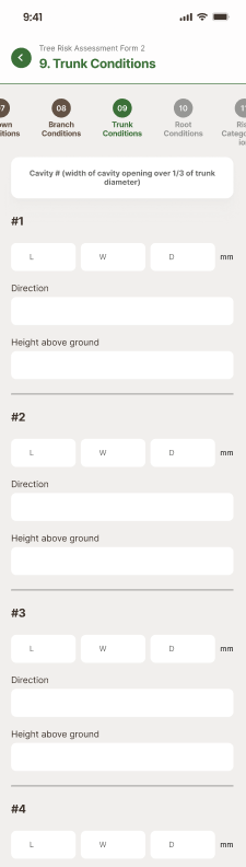 029+ <p>9.1 Cavity # (Width of cavity opening over 1/3 of trunk diameter) <br />9.1.1 Cavity #1 樹洞(樹洞洞口闊度大於主幹直徑1/3)<br />9.1.1.1 L 長<br />9.1.1.2 W 闊<br />9.1.1.3 D 深<br />9.1.1.4 Direction 方向<br />9.1.1.5 Height above ground 離地面高度</p>