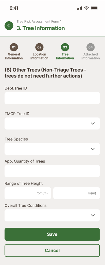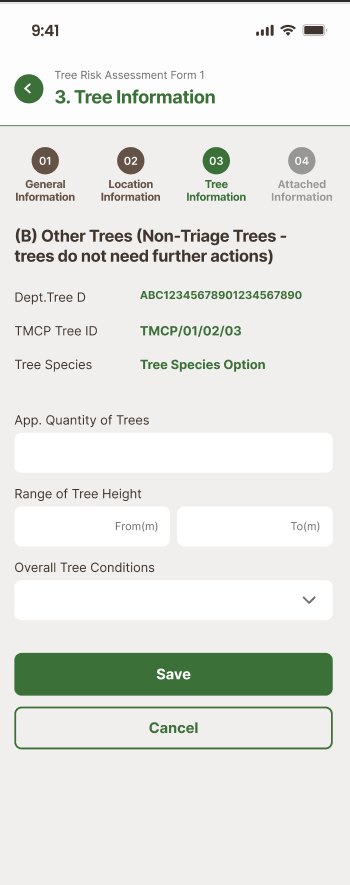 1.選擇部門樹木編號,選擇後顯示對應的樹木編號,樹種 2.輸入大約樹木數量 3.輸入樹高返回 4.選擇整體樹木狀況 |