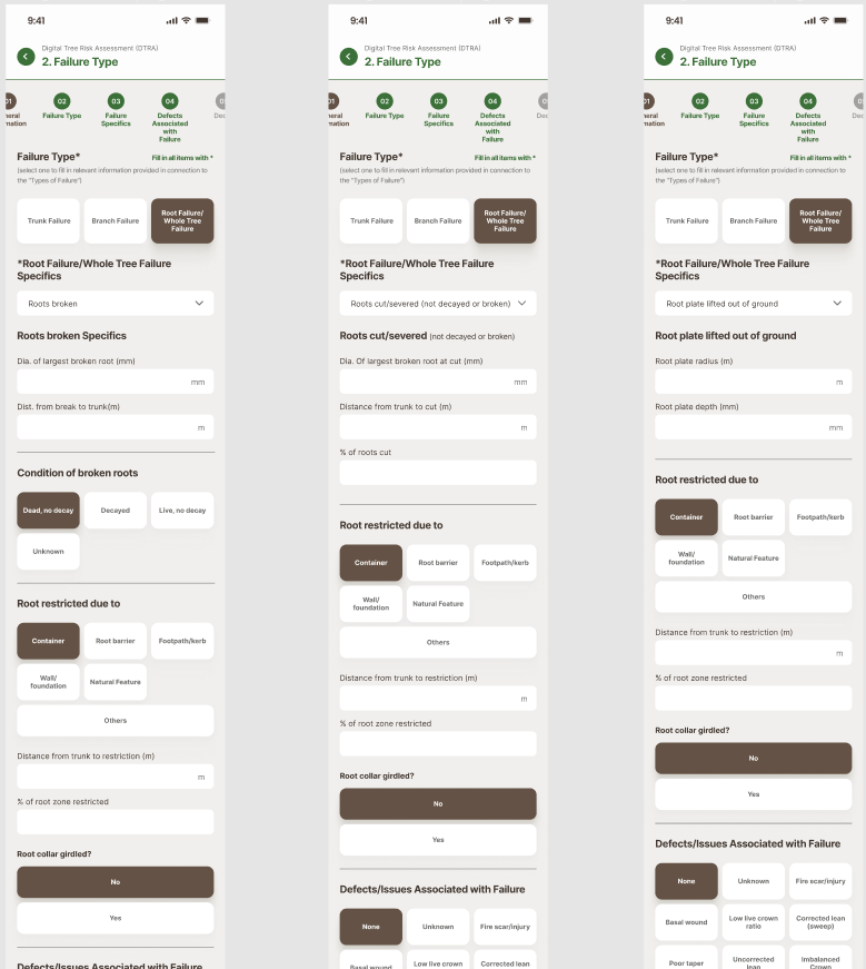 3(2C) *Root Failure/Whole Tree Failure Specifics *根部折斷/整株倒塌 下拉選擇框,根據下拉選擇框顯示(圖123) 3(2C).1 Roots broken 根部斷裂 3(2C).2 Roots cut/severed (not decayed or broken) 樹根被切斷 (非腐爛或斷裂) 3(2C).3 Root plate lifted out of ground 根基翻倒 3(2C).4 Root restricted due to 根部伸展範圍受限制 4(2C) Defects/Issues Associated with Failure 與倒塌相關的結構缺陷及事項 |