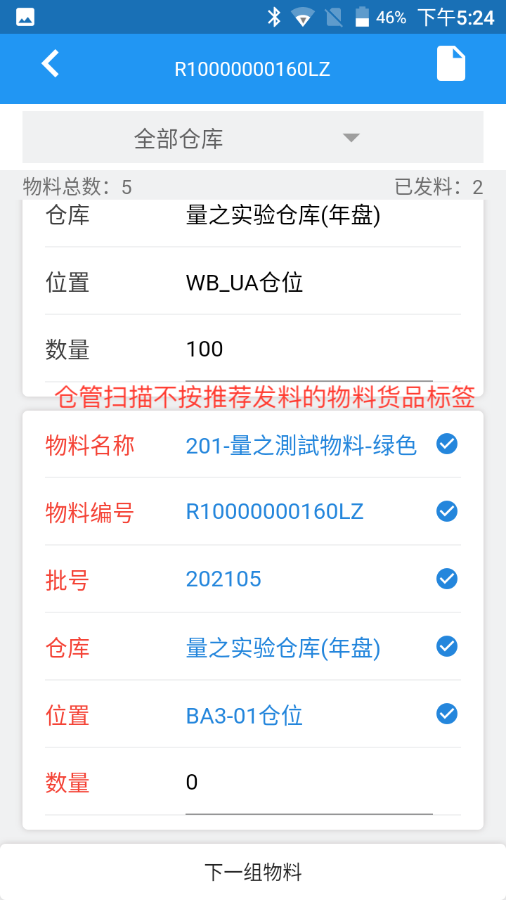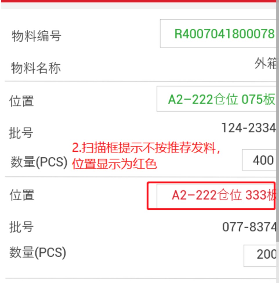 3.批号、位置都为红色时,视为该物料已发,已发物料加一;