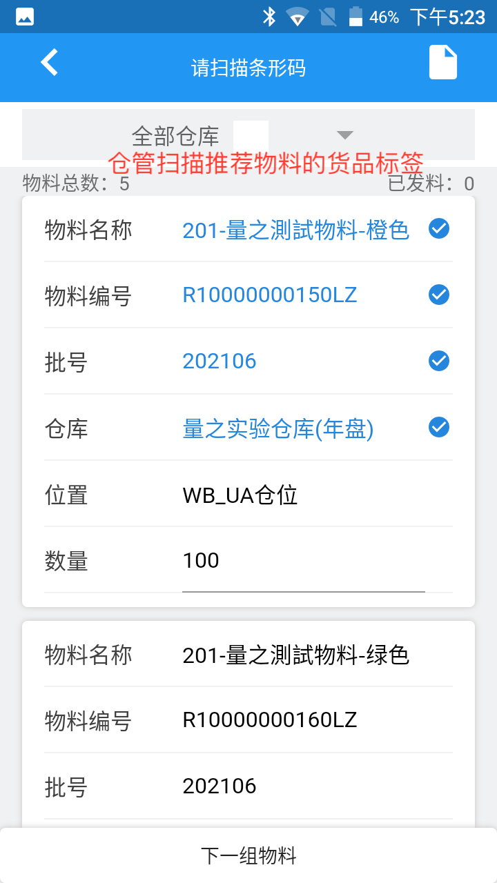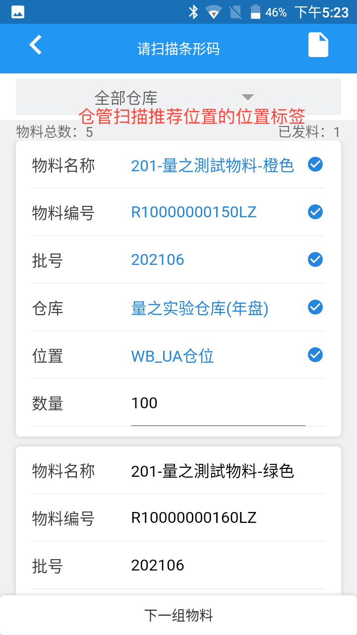 3.页面显示最后一组物料,点击【下一组】物料